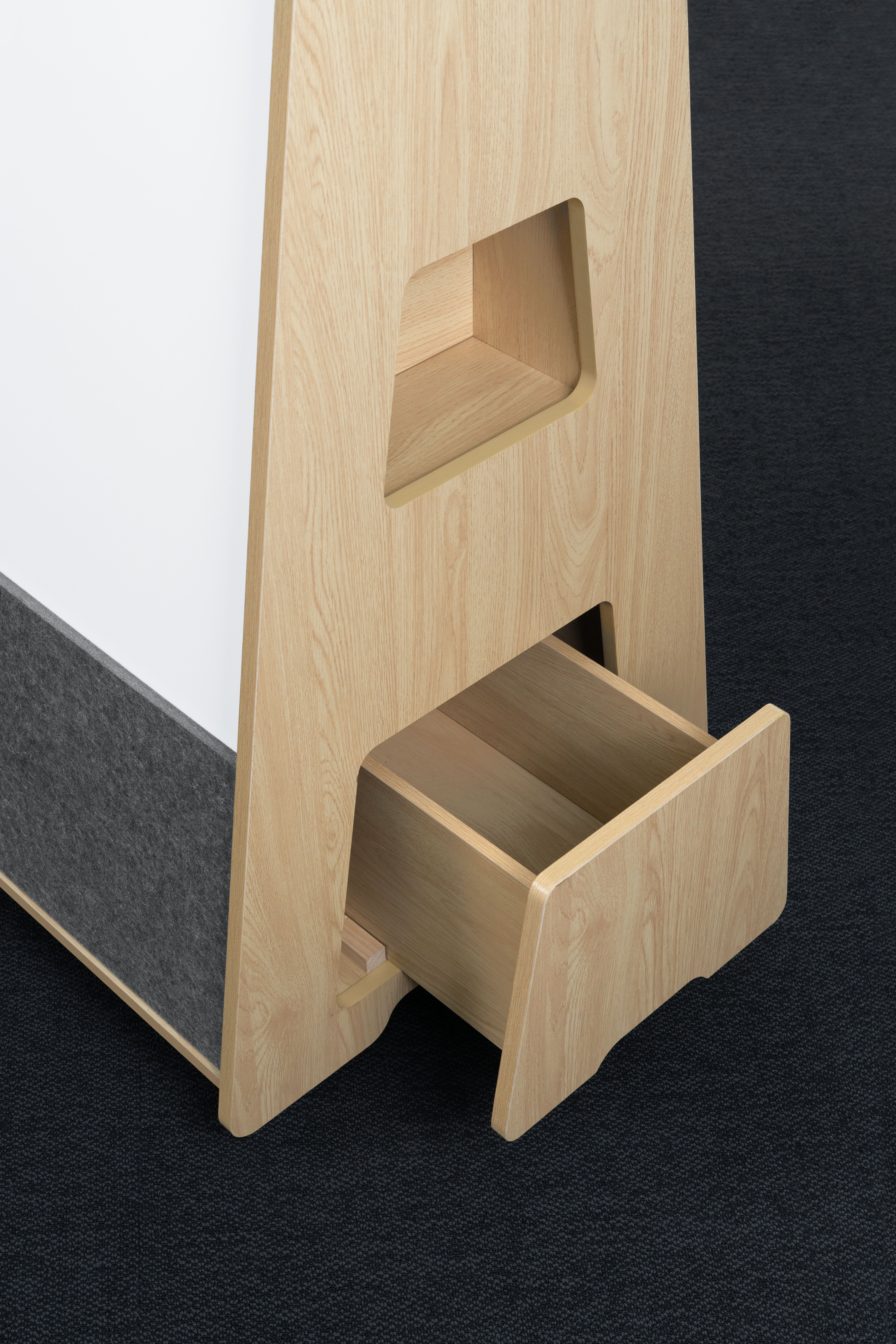 Idea Board – the multi-functional storage mobile whiteboard. Featuring an A-frame design in a wood finish. Offering two large writng surfaces and a magentic recpetive acoustic pinboard base. Store away tools and accessories in the side drawers and storage cubby holes.• Double-sided magnetic whiteboard surface• 1820(H) x 1000(W) x 700(D)mm• Built-in storage drawers and cubby holes• Includes flipchart hooks• Magnetic acoustic panel pinboard• 6 castor wheels for ultimate mobility