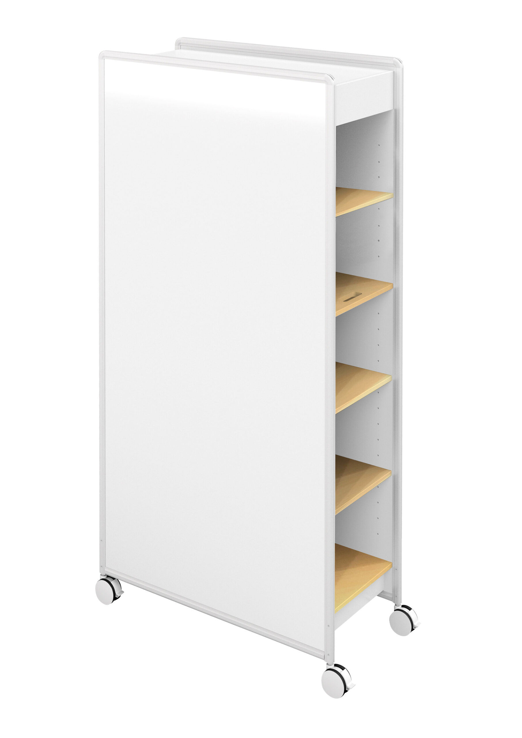 Multi-functional Mobile Whiteboard Wall – Perfect for Future Focused Learning EnvironmentsEasily movable double-sided magnetic whiteboard with storage that is split into two making it perfect for shared and adaptable learning environments. Each end has two adjustable shelves, giving 8 compartments in total for storage.• Easy pull handle on either end• Four large easy glide castors, two lockable• Two adjustable shelves each end with one fixed• Dimensions (W x H x D): 840 x 1800 x 374mm